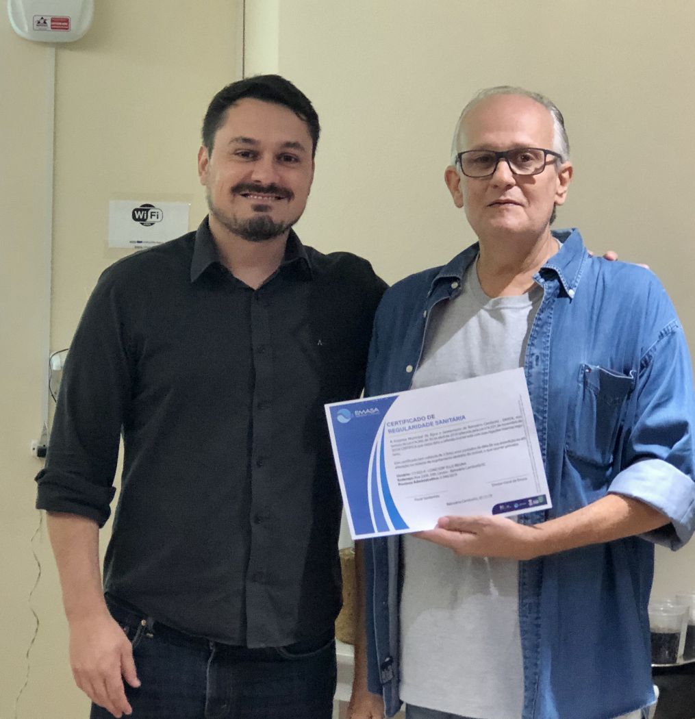 A Empresa Municipal de Água e Saneamento (Emasa), entregou nesta quarta-feira (26) o 5º Certificado de Regularidade Sanitária para o Condomínio Edifício Ellis Regina, localizado na Rua 2300 no Centro de Balneário Camboriú. O documento previsto na Lei Municipal Nº4260, que integra um pacote de ações para despoluição de rios e mar contidas no programa Balneário Camboriú é a Nossa Praia, foi entregue pessoalmente pelo diretor-geral da Emasa, Douglas Costa Beber, para o síndico do prédio e demais moradores.