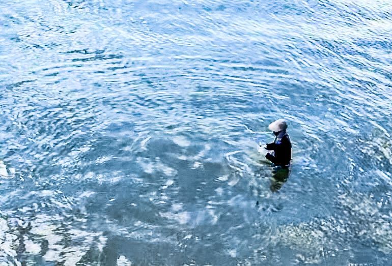 O coletor entra no mar até aproximadamente a altura da cintura para coletar as amostras, pois elas devem ser coletadas no local considerado mais representativo, que é na região de profundidade aproximada de 1 metro. O deslocamento até o local da coleta tem que ser feito lenta e gradualmente para que não interfira no material coletado.