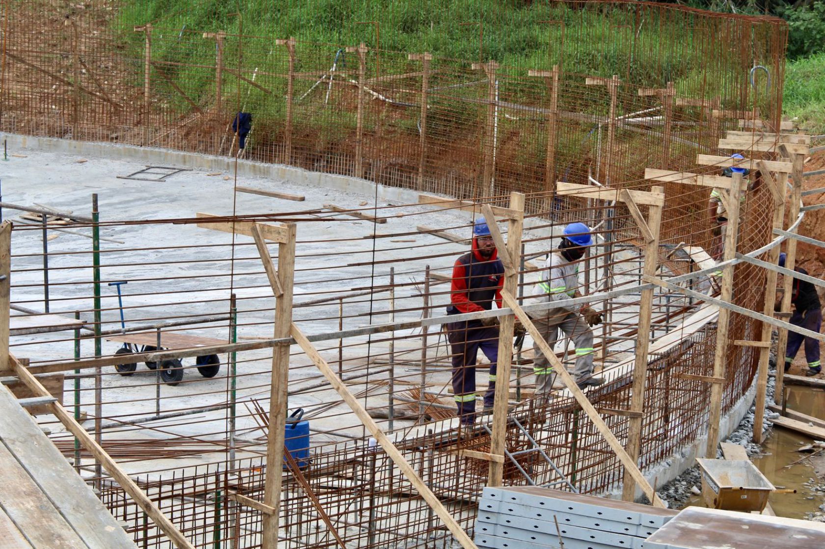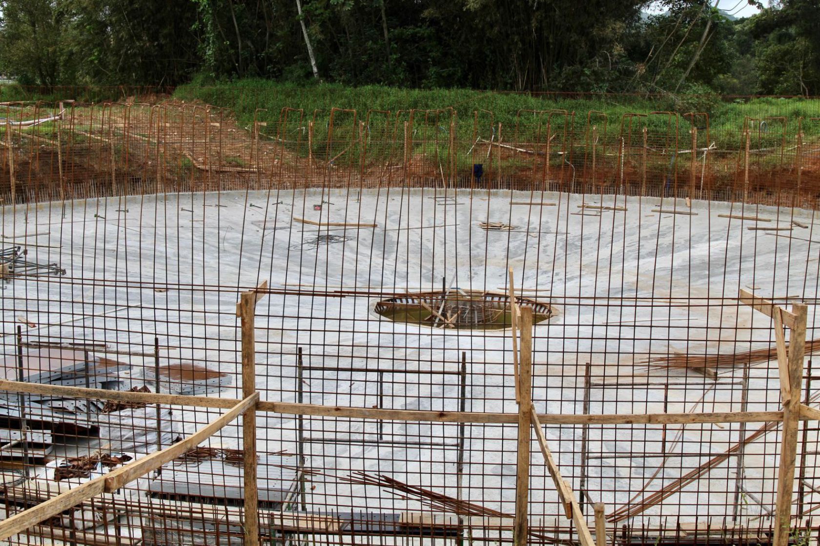 A construção do Quarto Decantador secundário da ETE Nova Esperança segue dentro da previsão, e já teve concretada a sua laje de fundo no último dia 26 de agosto. Atualmente, está sendo preparado toda a estrutura de armação de ferro para a instalação das formas para posterior concretagem das paredes laterais do equipamento.