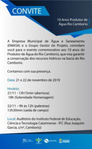 O Programa Produtor de Água do Rio Camboriú completa 10 anos no dia 26 de novembro e para celebrar a data, a Empresa Municipal de Água e Saneamento de Balneário Camboriú (EMASA) e o Grupo Gestor promovem um evento nos dias 21 e 22, no auditório do Instituto Federal de Educação, Ciência e Tecnologia Catarinense – Campus Camboriú. O evento contará com palestras, painéis, convidados ilustres, e troca de informações.