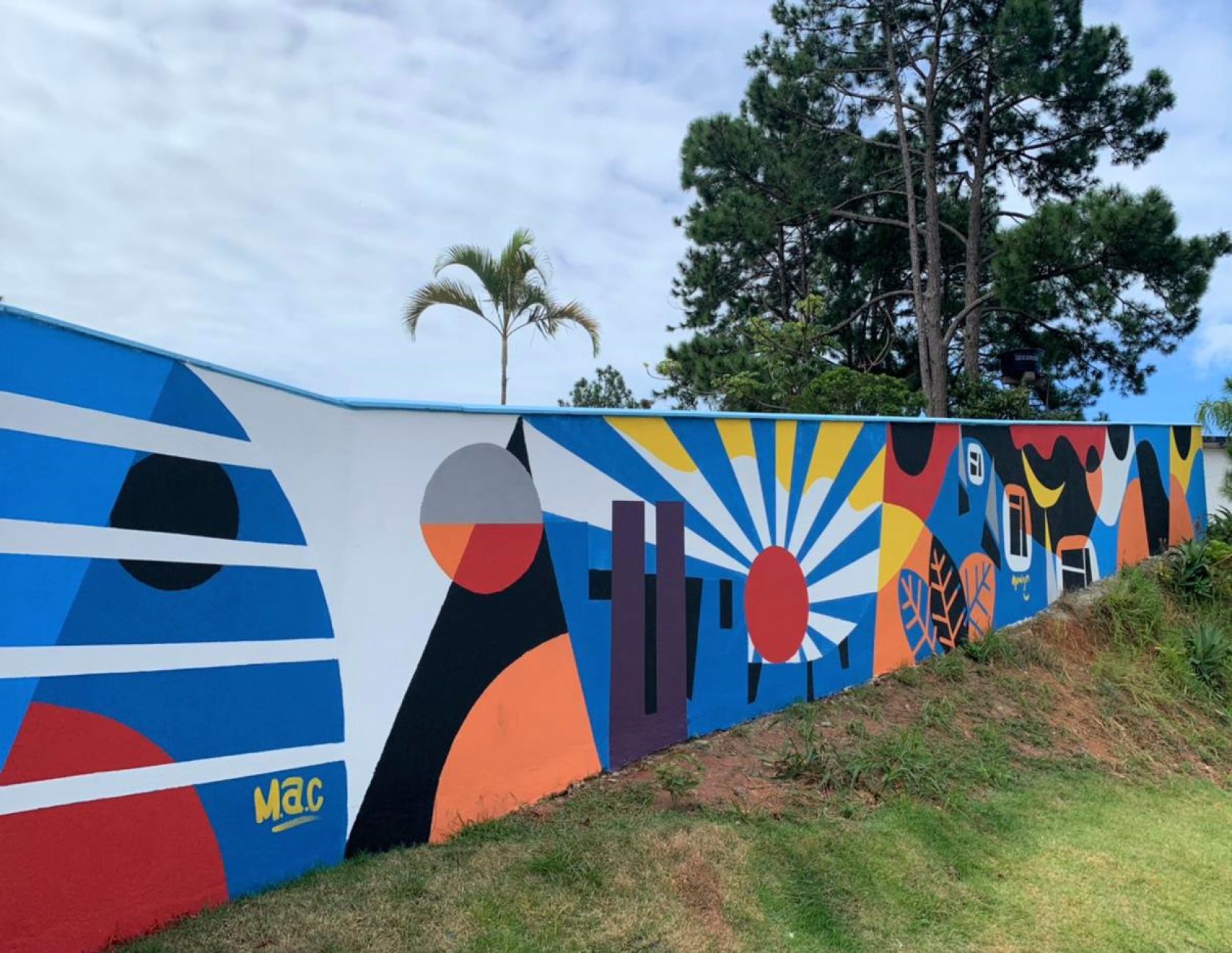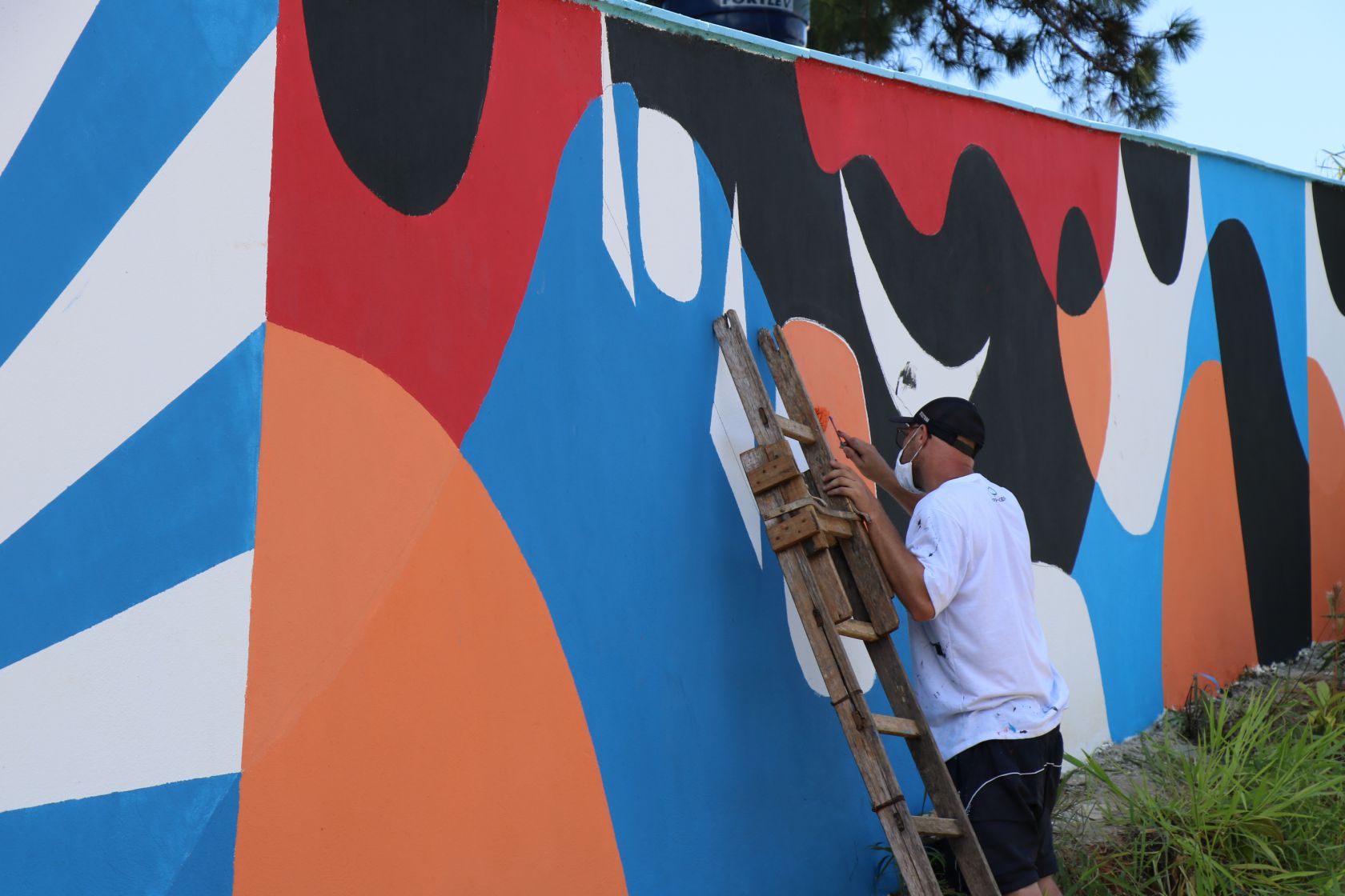 A pintura traz elementos característicos da cidade e também máscaras, acessórios indispensáveis desde o ano passado. A cor predominante é o azul, em vários tons, mas a obra de arte também conta com o laranja, cinza, branco, preto e vermelho. Segundo Marcelo, a intenção é que a obra sirva de testemunha dos tempos de pandemia. “O mural possui ícones da cidade e desse momento pandêmico, para que ele fique registrado por meio da arte urbana, mas de uma maneira lúdica. É uma mensagem também de esperança, de cura”, diz o artista.