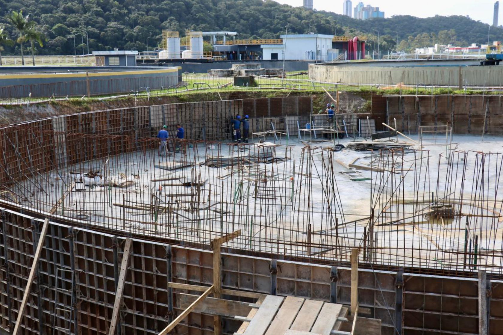 Está tudo pronto para a concretagem da primeira etapa das paredes laterais do novo decantador secundário que está sendo construído na Estação de Tratamento de Esgoto (ETE), do Bairro Nova Esperança.