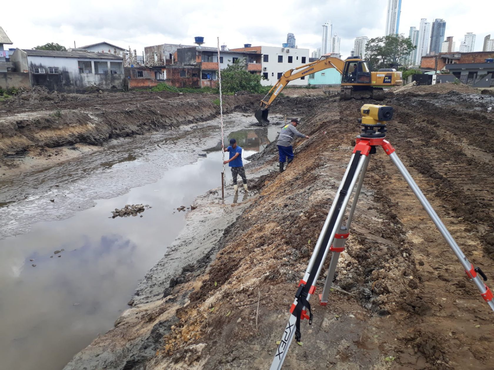 Nesta quinta-feira (21), os trabalhos seguem no trecho 06 (entre ruas Maria Mansoto e Adaci Santos Gomes), com instalação de gabião tipo caixa (contenção nas margens do rio), regularização de talude e topografia.