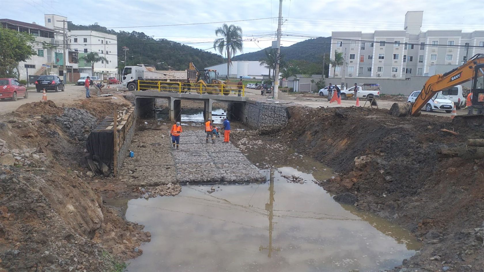 Os trabalhos de instalação de colchão reno (contenção no fundo do rio) também retomaram no trecho entre as pontes das ruas Pedro Pinto Felipe e Maria Mansoto. O período chuvoso das últimas semanas na região, incluindo Balneário Camboriú, acabou interferindo no andamento da obra, que teve os trabalhos limitados devido à chuva persistente e o nível do rio mais elevado, que interferem diretamente na completa execução.