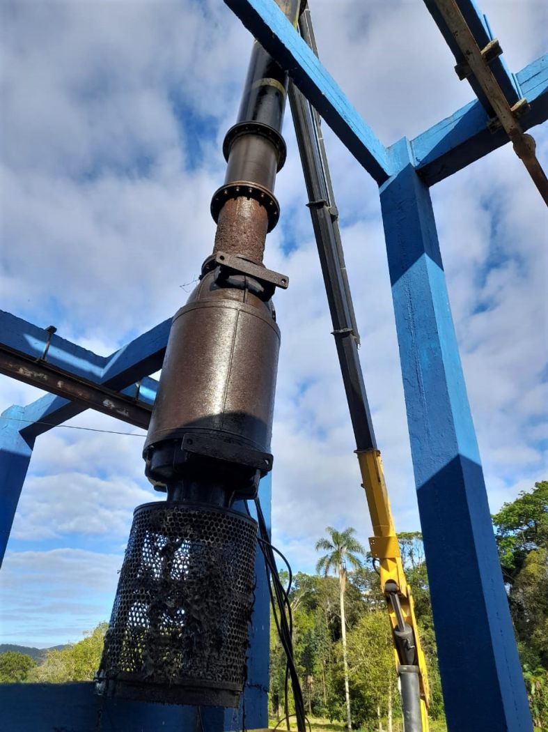 Na última semana, as bombas utilizadas para captação de água na Estação de Recalque de Água Bruta (ERAB), receberam manutenção preventiva e corretiva. A intervenção que é feita uma vez por ano, é necessária para manter a saúde do sistema de captação de água bruta e a eficiência das bombas. Como são quatro bombas, é executado uma por vez, não afetando o abastecimento.