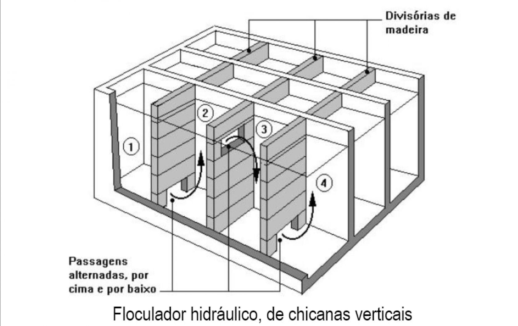 Na etapa seguinte, a chamada floculação, a agitação é reduzida gradativamente com a finalidade de aglutinar mais partículas que se encontram em dispersão. Nos floculadores, a água passa por um percurso entre chicanas de madeira (passagens em zigue-zague). “Esse percurso, que reduz gradativamente a agitação da água, provoca o choque das partículas entre as paredes de madeira, fazendo com que se agrupem e dessa maneira, formem flocos maiores e pesados”, explica Joanna.