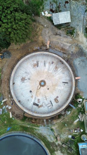 A próxima etapa será a impermeabilização interna do decantador. Uma vez pronta esta etapa será feita a instalação do raspador, equipamento que já se encontra na ETE, assim como a colocação das tubulações de interligação com o sistema existente e a urbanização da área.