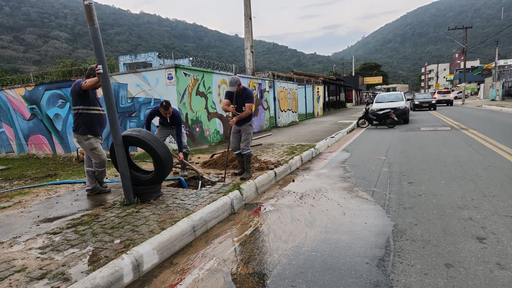 Conserto emergencial em tubulação rompida na rede de água na esquina da Rua Hermógenes de Assis Feijó com a Rua José Francisco Vítor, afeta o abastecimento de água no Bairro da Barra nesta quarta-feira (13).