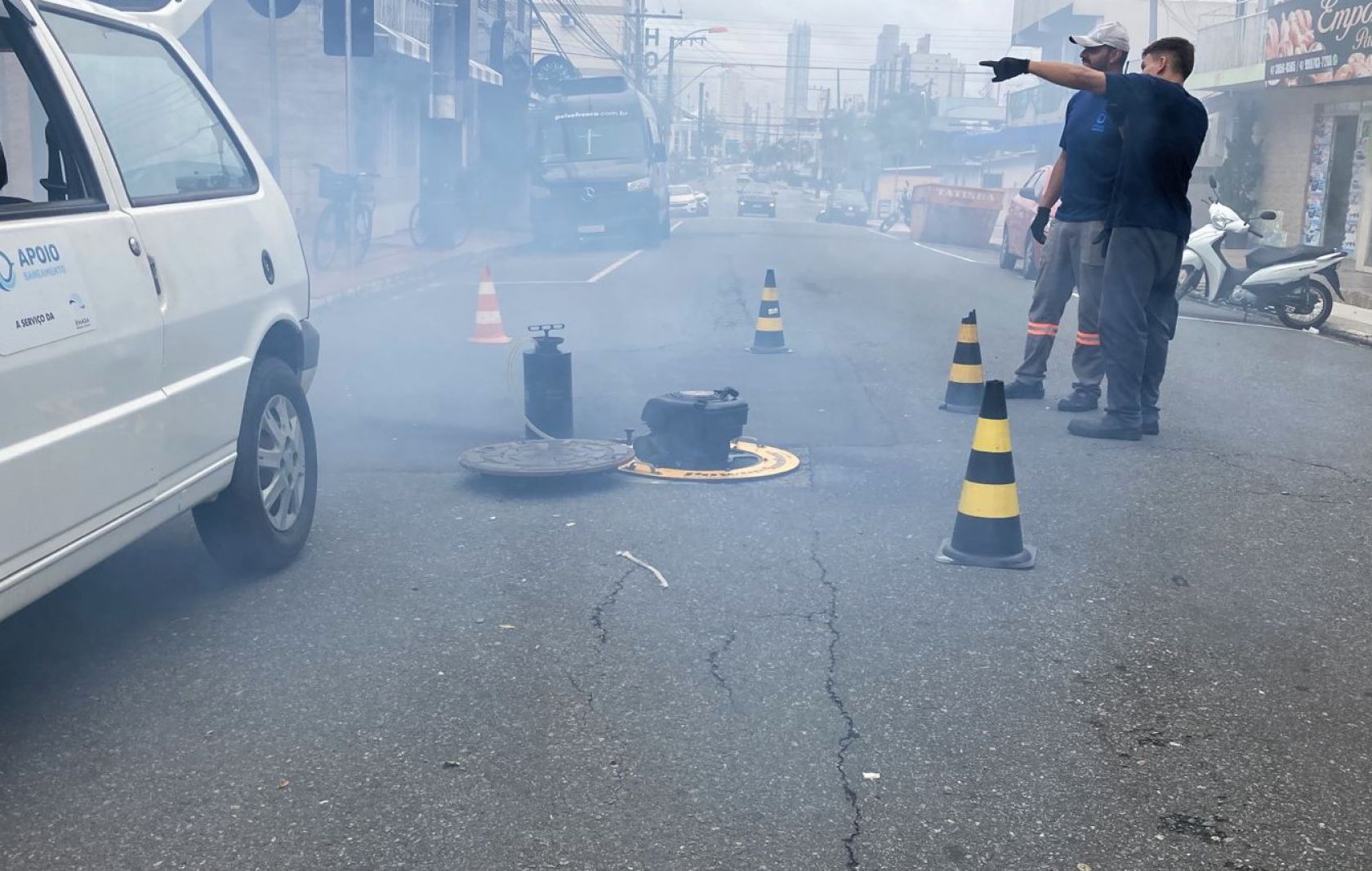 O teste de fumaça é uma técnica utilizada para detectar irregularidades e vazamentos na rede de esgoto. A intervenção é feita por meio do Poço de Visita (PV) e uma fumaça especial, não tóxica, e que não representa risco à saúde, é injetada na rede para constatar as inadequações. A fumaça pode sair pela calha ou alguma saída de esgoto dentro dos imóveis, quando o pluvial do imóvel está conectado à rede de esgoto externa; ou nas bocas de lobo, quando é algum problema na própria rede.