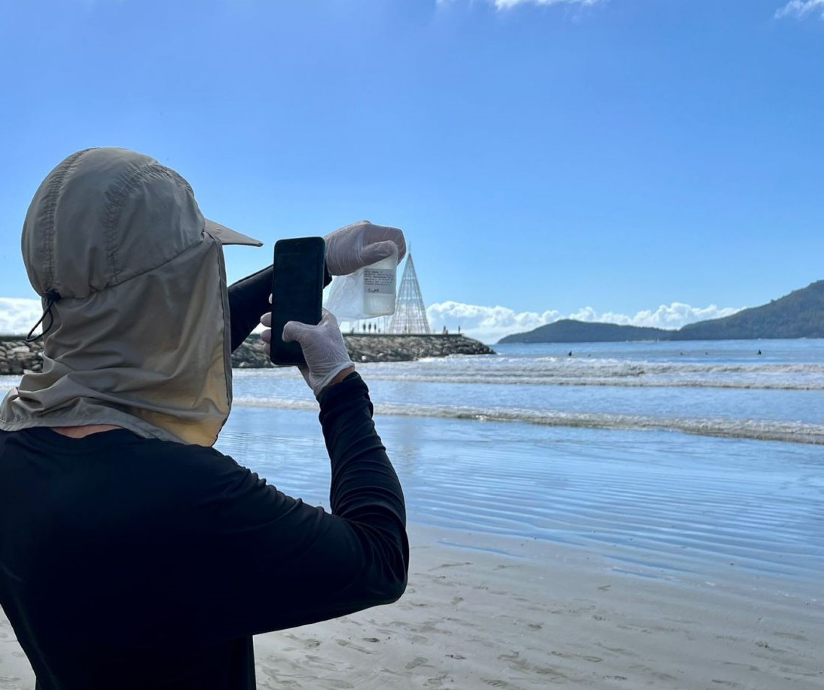 O coletor entra no mar até aproximadamente a altura da cintura para coletar as amostras, pois elas devem ser coletadas no local considerado mais representativo, que é na região de profundidade aproximada de 1 metro. O deslocamento até o local da coleta tem que ser feito lenta e gradualmente para que não interfira no material coletado.