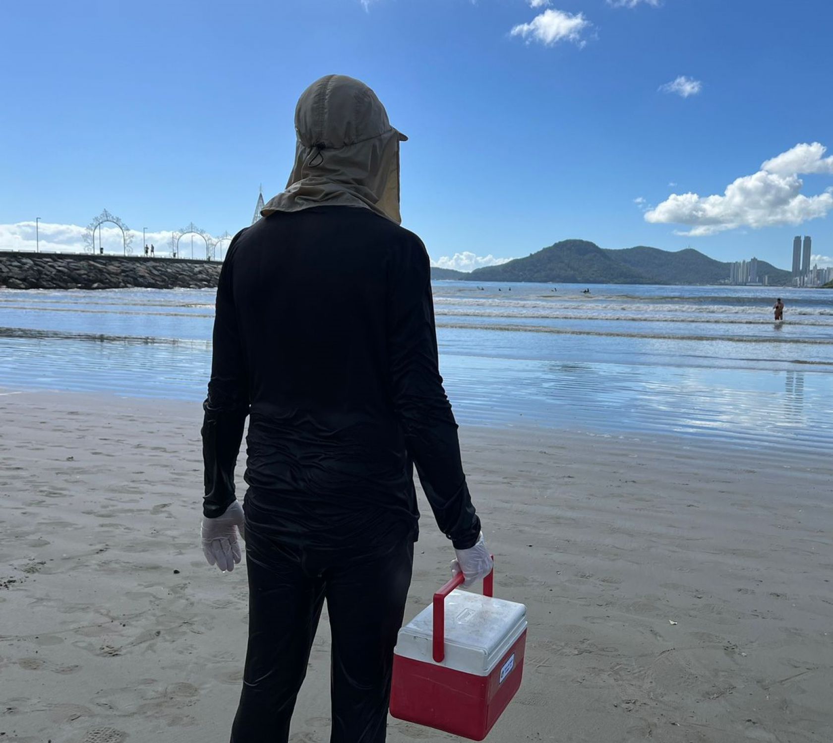 Cada responsável pela coleta deve utilizar vestimentas que sigam as determinações da empresa, tais como camisa com proteção UV, calça de neoprene, proteção para cabeça (boné, chapéu) e luvas próprias de procedimento.