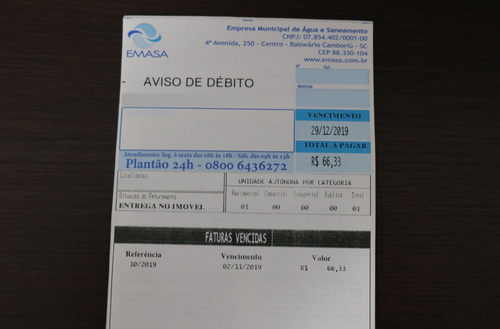 Caso o consumidor possua faturas em aberto e queira regularizar a situação, as informações de valores e condições de pagamento não são informadas pelos Canais de Atendimento. Sendo necessário dirigir-se pessoalmente até o balcão de atendimento na sede da EMASA, localizada na 4ª Avenida, 250, Centro –de segunda a sexta-feira das 8h às 18h e aos sábados das 9h às 12h.