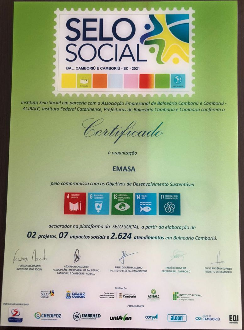 O Selo Social reconhece e certifica projetos que impactem positivamente na sociedade. No caso da Emasa, com as ações desenvolvidas pelos dois programas voltadas à promoção de práticas e responsabilidades na preservação dos recursos hídricos em Balneário Camboriú, atingiram cinco dos 17 objetivos para o alcance das metas da Agenda 2030 da ONU no Brasil, sendo: 4. Educação de Qualidade; 6. Água Potável e Saneamento; 13. Ação contra a Mudança Global do Clima; 14. Vida na Água; e 17. Parcerias e meios de implementação.