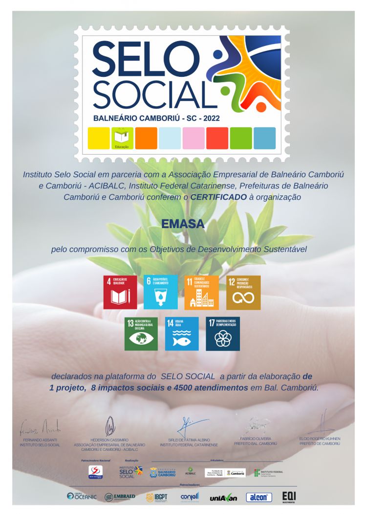 O Selo Social reconhece e certifica projetos que impactem positivamente na sociedade. No caso da Emasa, com as ações desenvolvidas pelo programa JACAMASA, voltadas à promoção de práticas e responsabilidades para a conscientização da preservação dos recursos hídricos e cuidados com o sistema de esgotamento sanitário em Balneário Camboriú, atingiu sete dos 17 objetivos para o alcance das metas da Agenda 2030 da ONU no Brasil, sendo: 4. Educação de Qualidade; 6. Água Potável e Saneamento; 11. Cidades e Comunidades Sustentáveis; 12. Consumo e Produção Responsáveis; 13. Ação contra a Mudança Global do Clima; 14. Vida na Água; e 17. Parcerias e meios de implementação.