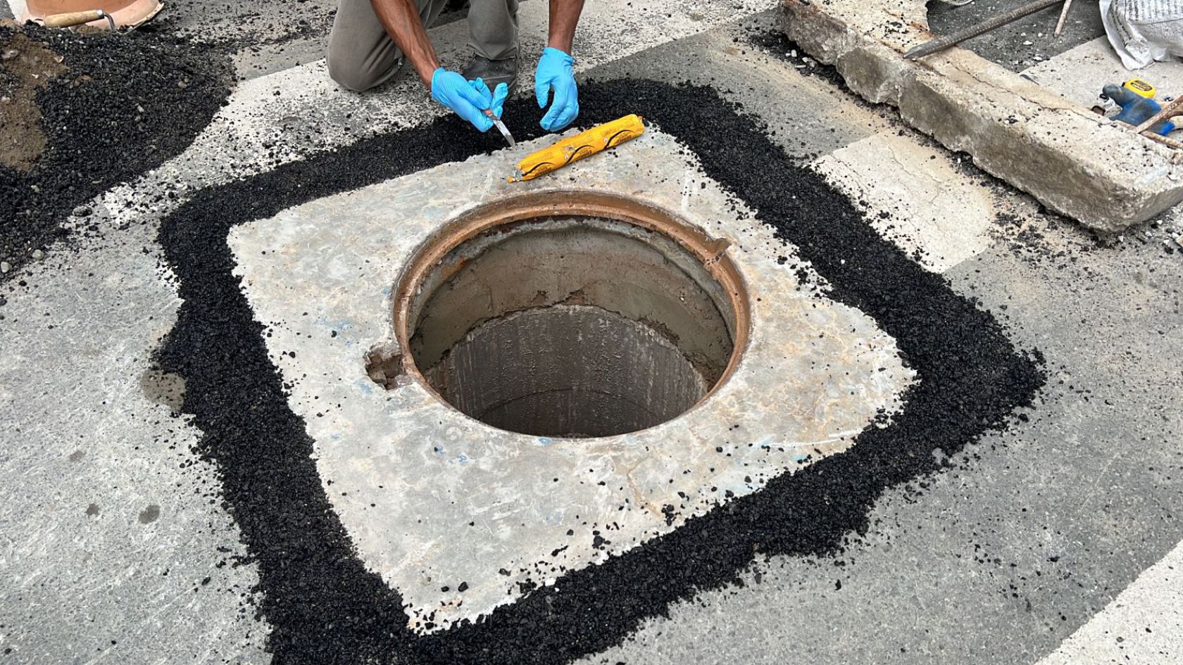 Por volta das 02h da madrugada, ocorre a substituição de uma tampa de Poço de Visita (PV) na Av. Brasil, esquina com Av. Central. O trânsito fica em meia pista. O serviço ocorre à noite, devido ao grande fluxo de veículos nessas vias durante o dia.
