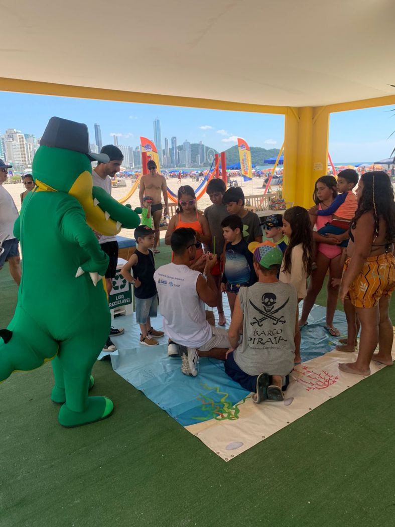 O jacaré mais querido de BC, a equipe do Programa de Educação Ambiental – PEA JACAMASA e voluntários, promoveram atividades lúdicas e interativas, principalmente com as crianças. Junto com o momento de diversão, foram repassadas orientações de conscientização ambiental para o cuidado com a praia, com a água, natureza, descarte de lixo e reciclagem.