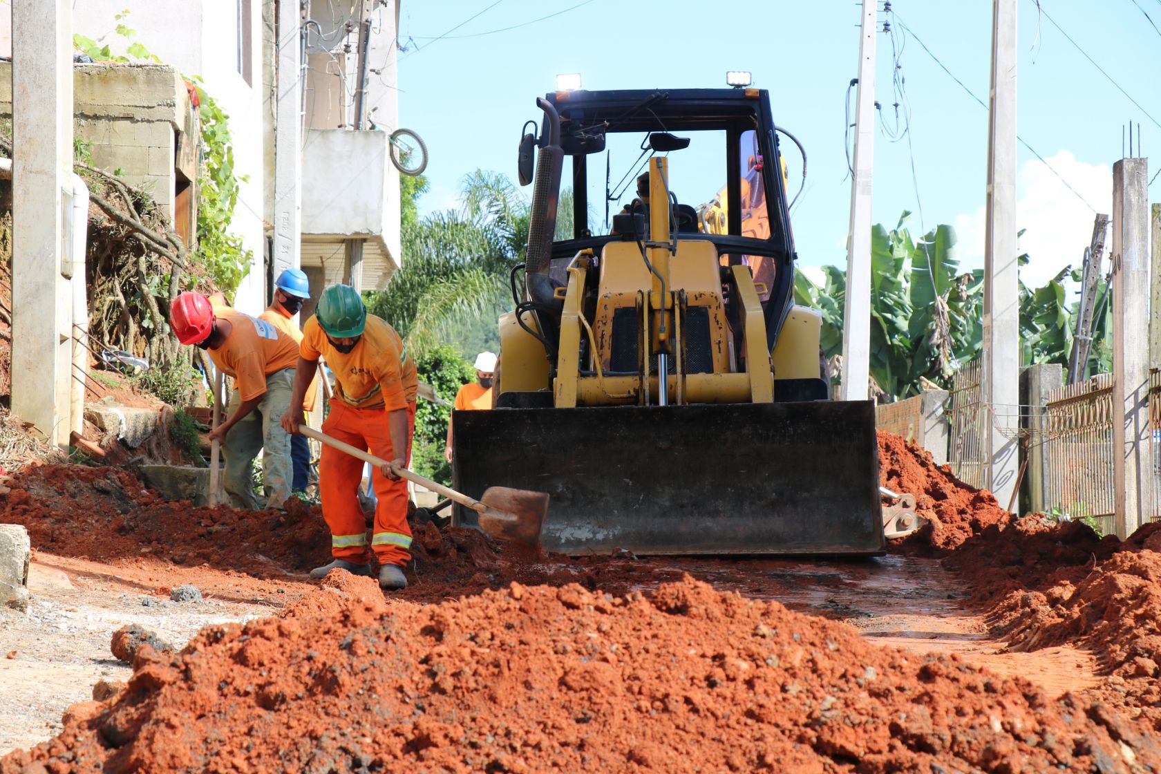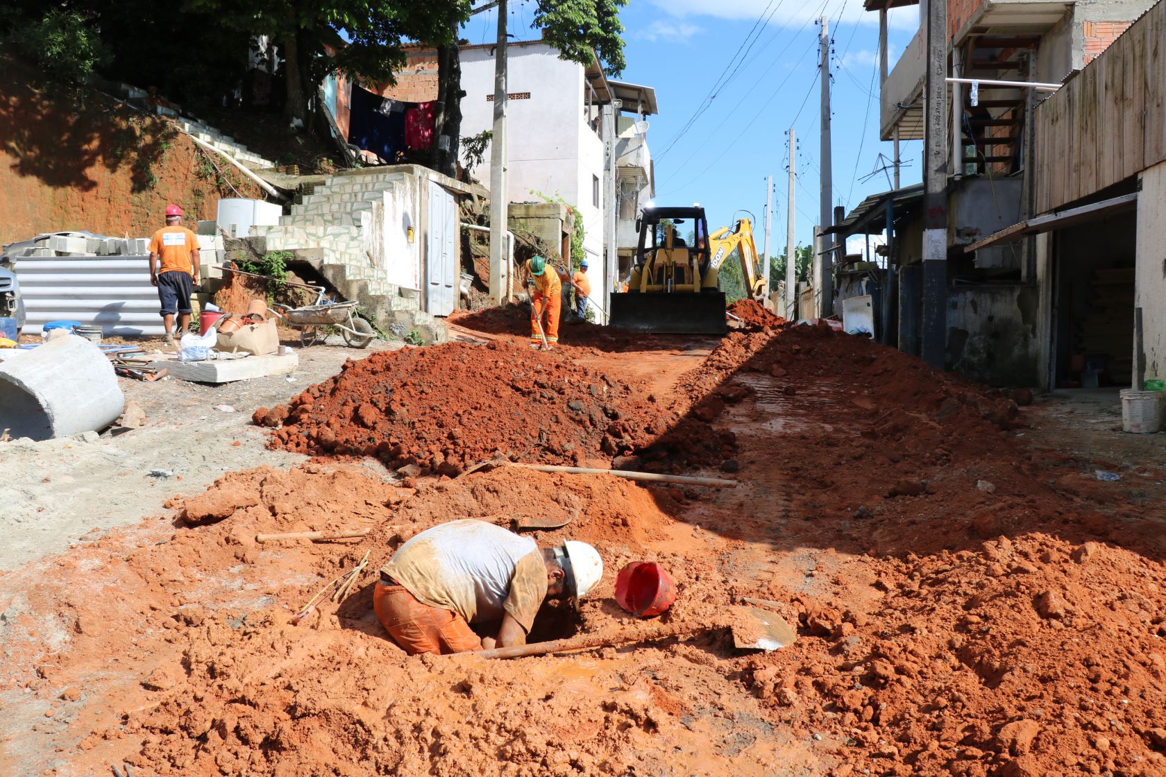 A implantação da rede coletora de esgoto continua no Loteamento Jardim Denise, no Bairro Nova Esperança, com execução na Rua A - Loteamento Denise. No trecho em obras o trânsito fica em meia pista.