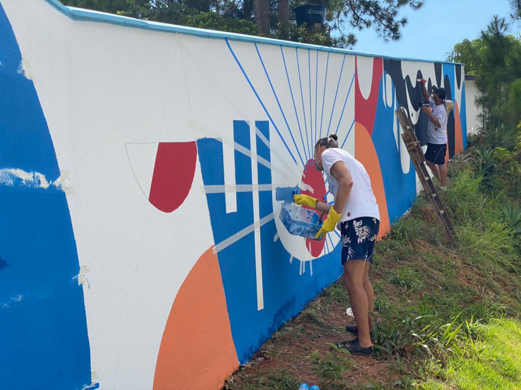 A pintura traz elementos característicos da cidade e também máscaras, acessórios indispensáveis desde o ano passado. A cor predominante é o azul, em vários tons, mas a obra de arte também conta com o laranja, cinza, branco, preto e vermelho. Segundo Marcelo, a intenção é que a obra sirva de testemunha dos tempos de pandemia. “O mural possui ícones da cidade e desse momento pandêmico, para que ele fique registrado por meio da arte urbana, mas de uma maneira lúdica. É uma mensagem também de esperança, de cura”, diz o artista.
