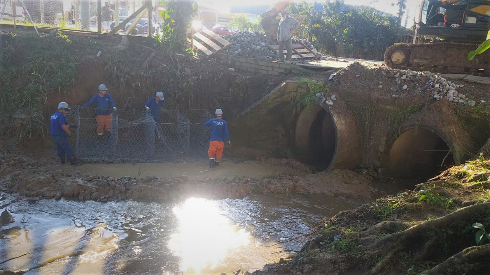 Já os serviços em uma das pontes que cortam o rio, localizada na Rua Adaci Santos Gomes com a Rua Donaciano Santos, estão suspensos até que a água do rio escoe, devido à forte chuva da última madrugada. Essa etapa das pontes compreende a demolição e execução de galerias celulares em substituição à ponte existente, para aumentar a capacidades de vazão da água do rio no local, e assim, evitar os alagamentos que ocorriam quando chovia muito. A previsão de execução dessa etapa é até o dia 30 de junho, com a obstrução total da via. O local está sinalizado com tapumes e placas para orientar os motoristas e evitar acidentes.
