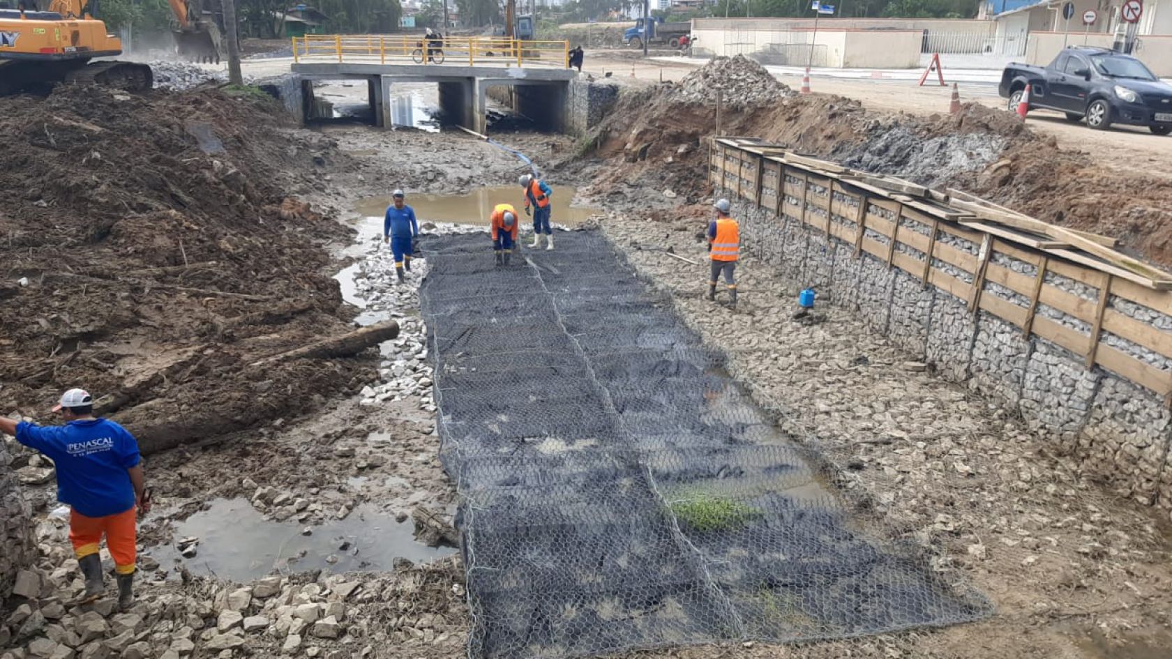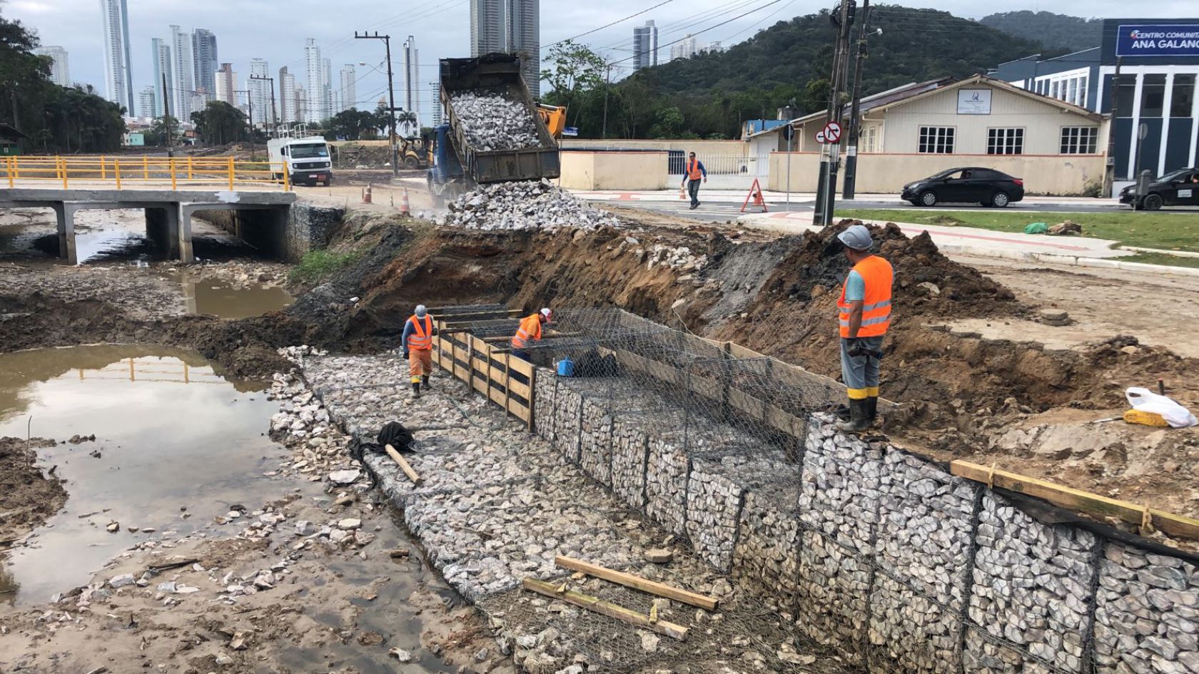 Os trabalhos de instalação de colchão reno (contenção no fundo do rio) também retomaram no trecho entre as pontes das ruas Pedro Pinto Felipe e Maria Mansoto. O período chuvoso das últimas semanas na região, incluindo Balneário Camboriú, acabou interferindo no andamento da obra, que teve os trabalhos limitados devido à chuva persistente e o nível do rio mais elevado, que interferem diretamente na completa execução.