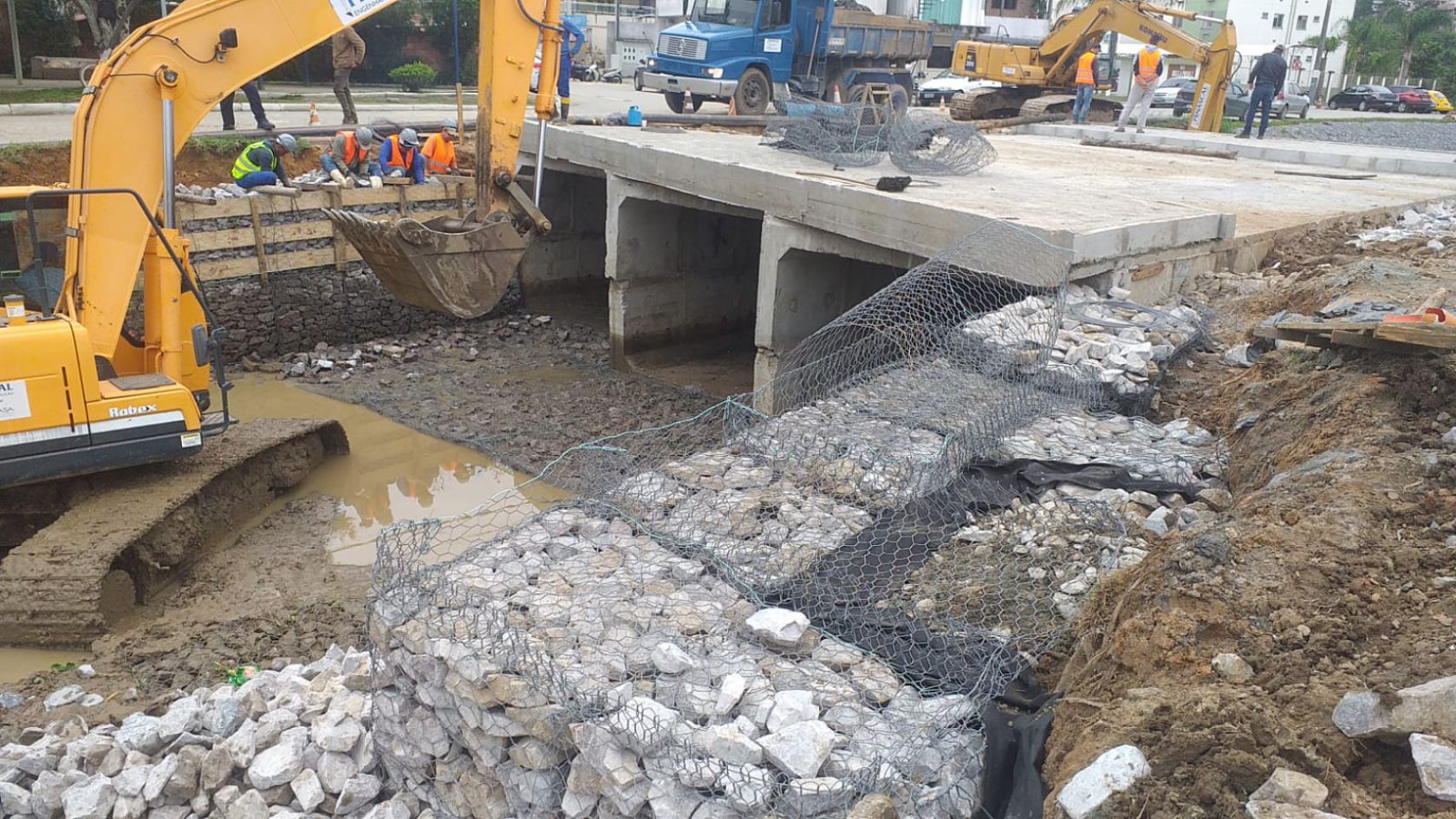A obra da ponte na Rua Maria Mansoto, contemplada no projeto de limpeza das margens, dragagem e readequação de calha do Rio das Ostras, avança para mais uma etapa, com a concretagem da estrutura, incluindo as calçadas em paver. Ao lado da ponte no trecho 06, segue a instalação de gabião caixa (contenção nas margens). Durante a semana, uma outra equipe trabalha no trecho 02 (próx. ruas Paulo Cunha e José Alves Cabral, Nova Esperança). Até o momento, a obra total foi executada em 90%, com previsão de término até o fim de outubro.