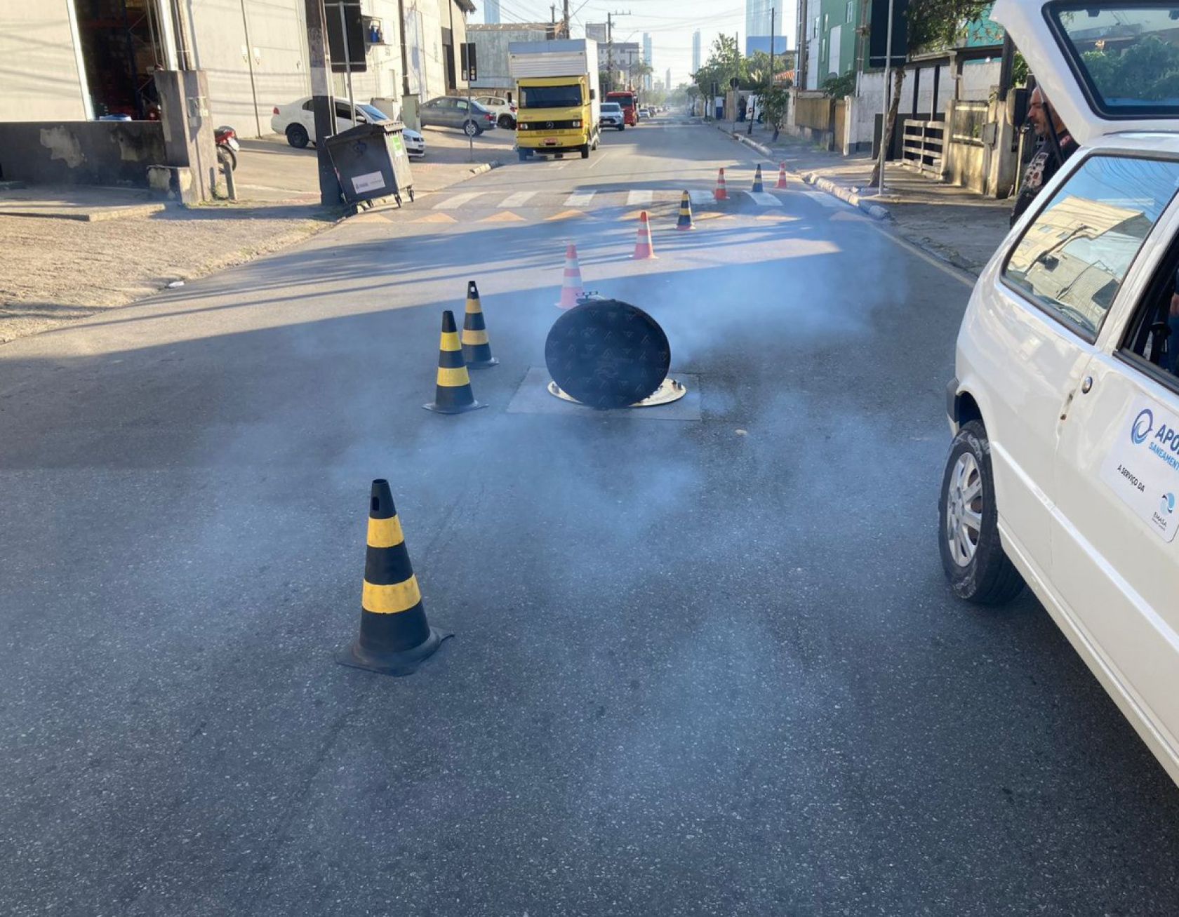 O teste de fumaça é uma técnica utilizada para detectar irregularidades e vazamentos na rede de esgoto. A intervenção é feita por meio do Poço de Visita (PV) e uma fumaça especial, não tóxica, e que não representa risco à saúde, é injetada na rede para constatar as inadequações. A fumaça pode sair pela calha ou alguma saída de esgoto dentro dos imóveis, quando o pluvial do imóvel está conectado à rede de esgoto externa; ou nas bocas de lobo, quando é algum problema na própria rede.